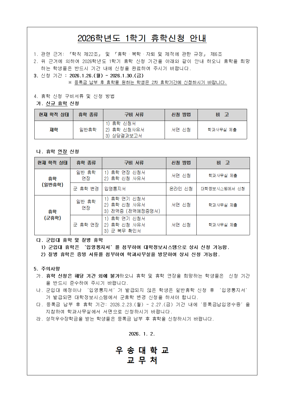 커뮤니티 공지사항 학과뉴스 포토갤러리 재학생 Q&A 자료실 전공동아리 공지사항Home커뮤니티공지사항 2026학년도 1학기 휴학 신청 안내 작성자 : 학과관리자 | 작성일 : 2026.01.21 | 조회수 : 31 첨부파일 2026학년도 1학기 휴학 신청 안내문001.png 휴학 복학 자퇴 및 제적에 관한 규정.pdf [1]휴학신청 매뉴얼(학생).pdf [85]휴학신청서류 .hwp [119]휴학연기신청서.hwp 목록 이전글 2026학년도 1학기 강의시간표 다음글 2026학년도 1학기 카자흐스탄 WSUK 프로그램 모집 안내문